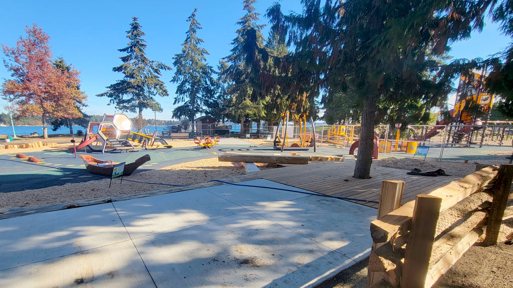 Upgrades transform the space into one large, relatively flat area which is fully accessible to all users. Rubber play surface or wood chips extend from the walkway by Swy-a-Lana Lagoon to the Rotary Centennial Garden.