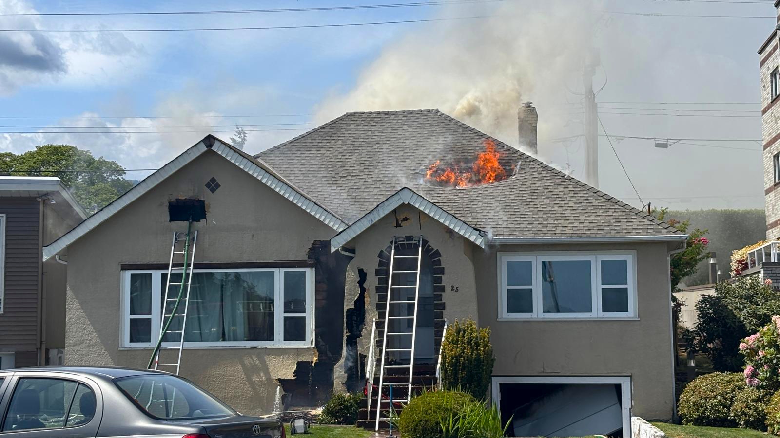 “The fire did get up into the walls, which moved up into the attic space, so now it becomes a little bit of a difficult fire to fight. The soffits are solid wood. We normally put water up in the soffits to get up into the roof, but at this time, we open up the gable ends, which is the side of the house…trying to get the rest of the fire out.”