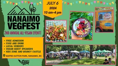 Nanaimo VegFest July 6th, 10 am - 4 pm. A Day of Vegan Food, Info and Fun! Join us for Nanaimo’s newest summer festival at Maffeo Sutton Park!